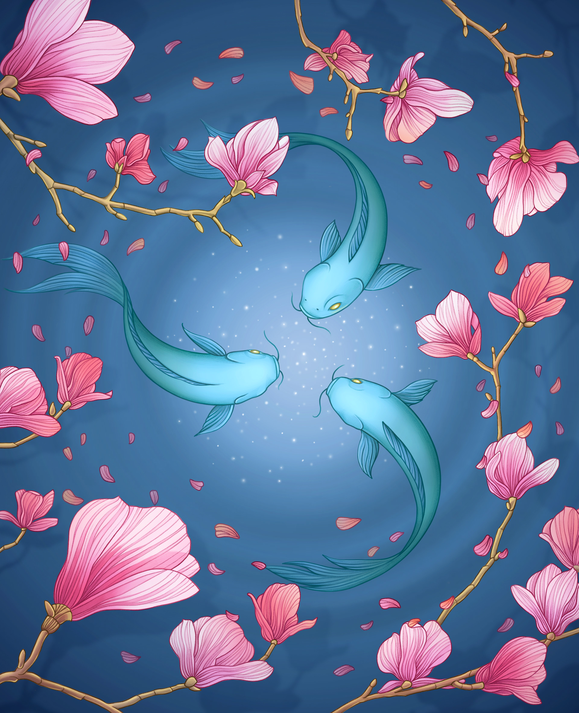Private commission, featuring beloved koi fish and pink marigolds.